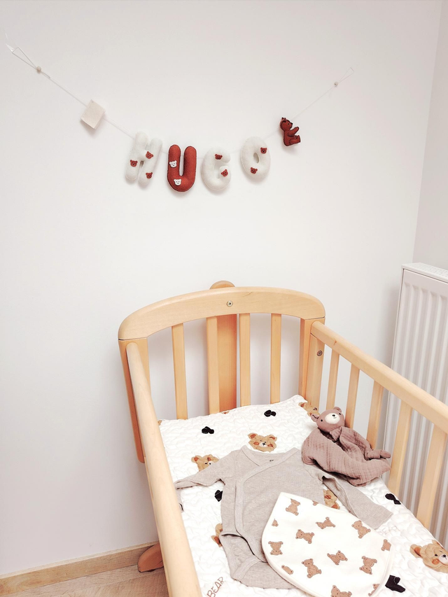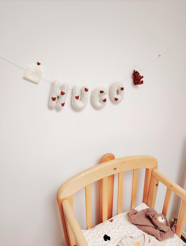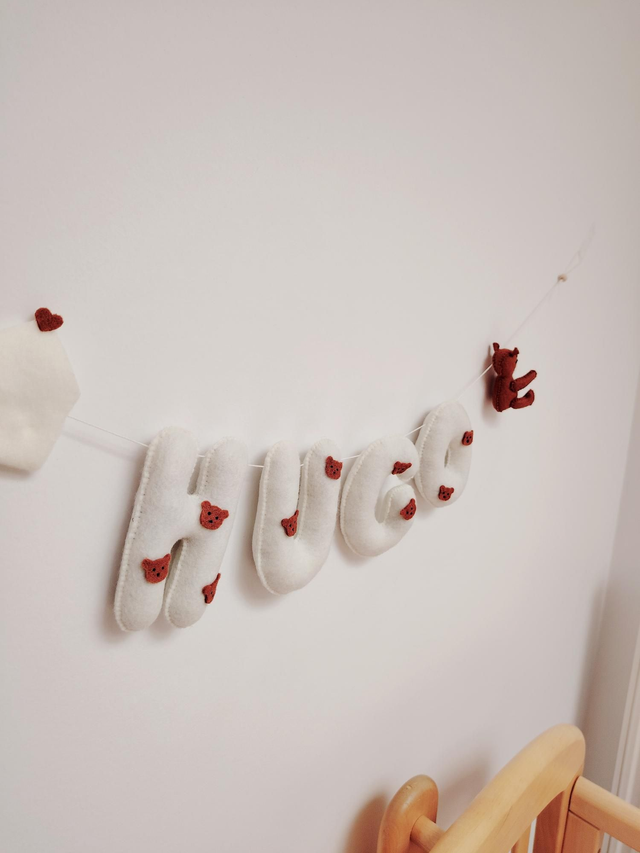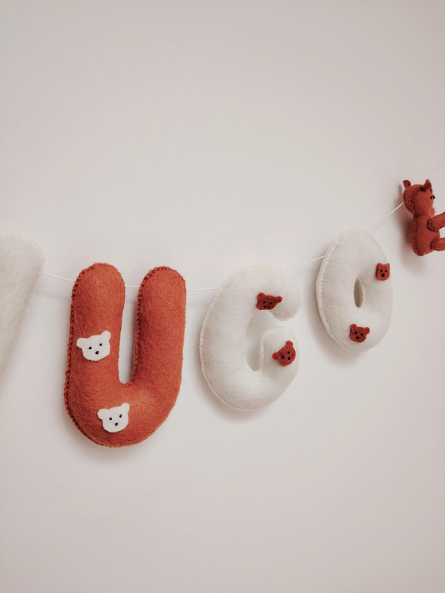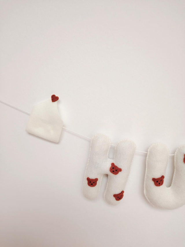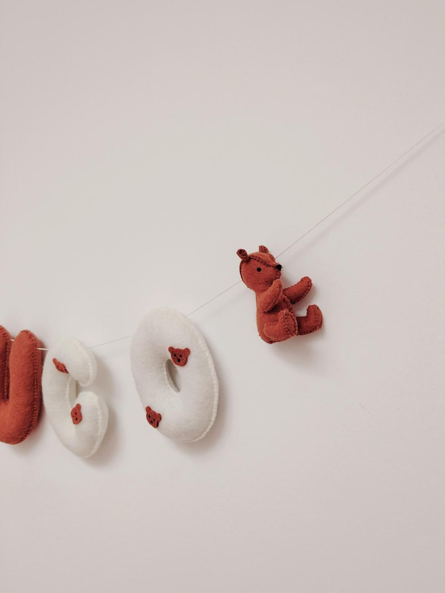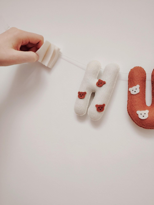 Voici une guirlande en feutrine personnalisée unique. Chaque lettre de cette guirlande est ornée de 2 têtes d'oursons, et à l'extrémité, un ourson et au choix : une enveloppe ou un livre.